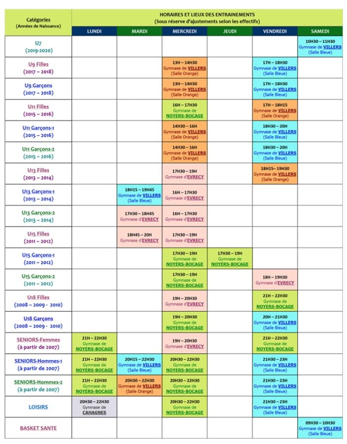 Voici le planning des entrainements, par catégorie, pour la saison à venir.